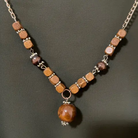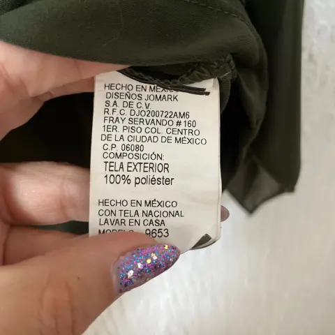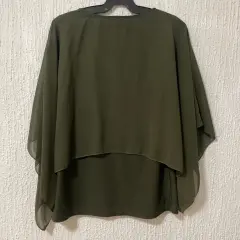Blusa de dos partes: top tipo playera y tela superior ligera y vaporosa, como capa.Color verde espinaca.Incluye collar dorado con cuentas de madera, que se puede quitar para lavar o usar otro.Marca líneas.Talla grande.Cuello redondo.Poliéster.