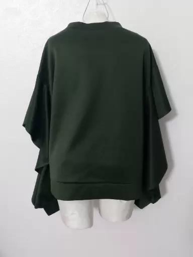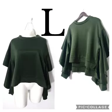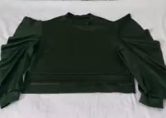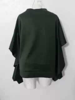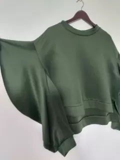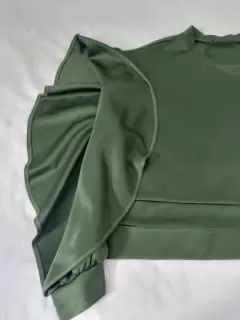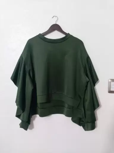 Blusa verde manga con olanes. Esta preciosa! Queda con todo.Minimo detalle (última foto) por defecto de fábrica, mperceptible.Talla L (oversize)Manga volante, queda el brazo descubierto.Tipo sudadera crop pero no queda muy corta.De axila a axila: 69 cmLargo delantero: 54 cmLargo trasero: 61 cm