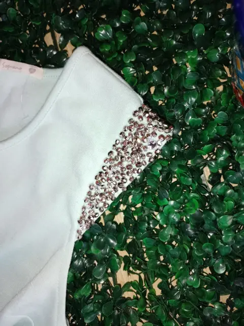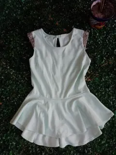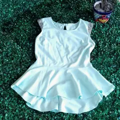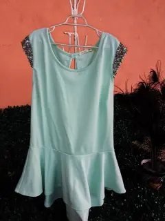 Blusa tipo peplum, color verde mentadetales en las mangas de pedrería plateada.Talla S
