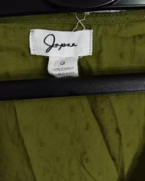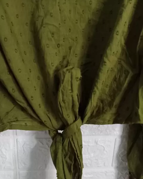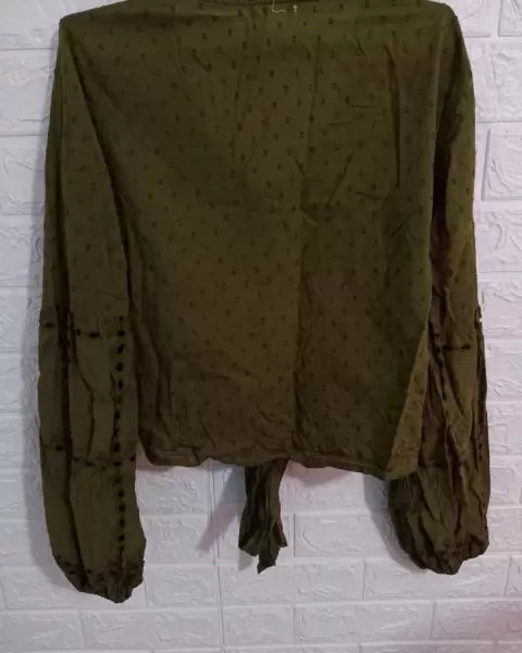 Blusa verde olivo. En perfecto estado. De manga larga, con cintas que se amarran en la cintura. De tela delgada.