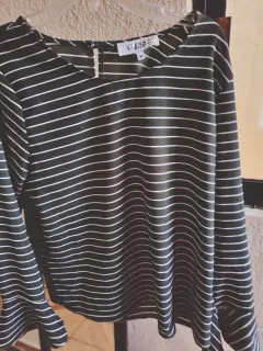 Blusa verde oscuro con mangas campana. Blusa verde oscuro con rayas blancas, de cuello redondo , se amolda a la figura de talla M