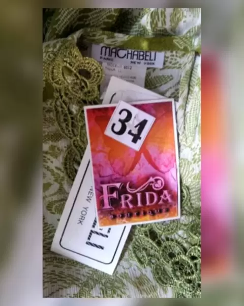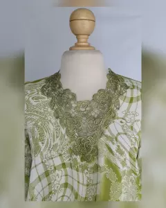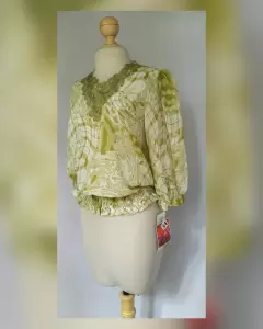 Blusa Vestir con Aplique Encaje. Blusa de vestir estampada en tonos BLANCO LINO/VERDE PERA, cuello V c/aplique encaje, cierre p/botonadura, manga 3/4 abullonada terminada en puño, elástico en cintura para mejor ajuste. Talla 34 (reducida, da a 30/32). Dimensiones cms: 36.5 hombro, 48 axila, 28.5 cms zona baja (da hasta 49.5 por el elástico), 65 largo, 45.5 largo manga, 100% poliéster. P/lavado en casa.