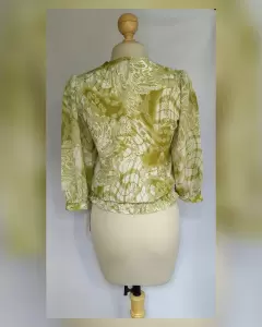Blusa de vestir estampada en tonos BLANCO LINO/VERDE PERA, cuello V c/aplique encaje, cierre p/botonadura, manga 3/4 abullonada terminada en puño, elástico en cintura para mejor ajuste. Talla 34 (reducida, da a 30/32). Dimensiones cms: 36.5 hombro, 48 axila, 28.5 cms zona baja (da hasta 49.5 por el elástico), 65 largo, 45.5 largo manga, 100% poliéster. P/lavado en casa.