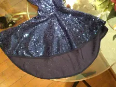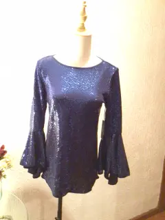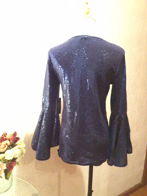 BLUSA MARCA VINCE CAMUTO, COLOR AZUL MARINO DE LENTEJUELA CON MANGA ACAMPANADA, TALLA XS, COLOR AZUL MARINO CUELLO REDONDO, CON ETIQUETA, STRECH, GENIAL PARA UNA FIESTA ELEGANTE. MEDIDAS : HOMBROS 42, PECHO 45, LARGO 62, MANGA LARGA 50 QUE DA A MÁS POR EL OLÁN , PERFECTO ESTADO.