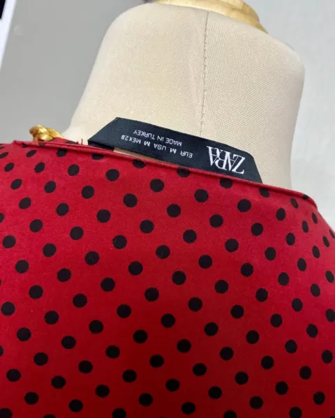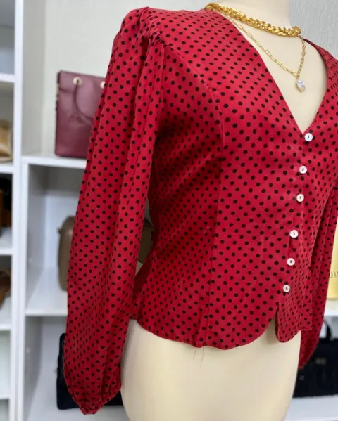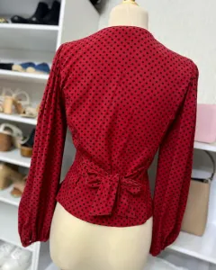 Bonita y elegante blusa color vino con lunares negros. Escote en V y mangas largas. En perfecto estado, sin ningún detalle.