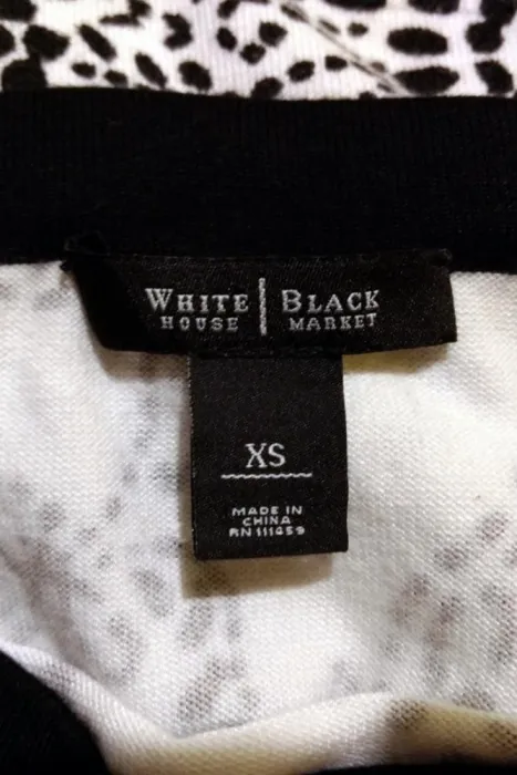BLUSA WHITE HOUSE BLACK MARKET XS. COLOR BLANCO CON NEGRO, STRETCH 16% NYLON, TEJIDO DE PUNTO, STRAPLESS, RESORTE EN ESCOTE, TALLA EXTRA CHICA, MEDIDAS DE UNA CARA: AXILA A AXILA 37 (ESTIRA HASTA LOS 54 CM), LARGO 41 CM.