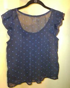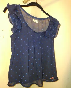 Blusa azul marino con puntos azul clarito, transparente, marca Hollister. Mide de axila a axila 44 cm.