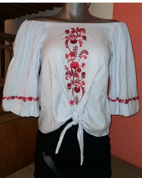 Hermosa blusa Zara trafaluc, con detalles bordados en rojo, hombros descubiertos y amarre en cintura.