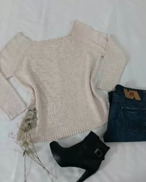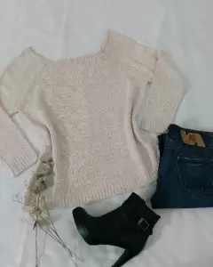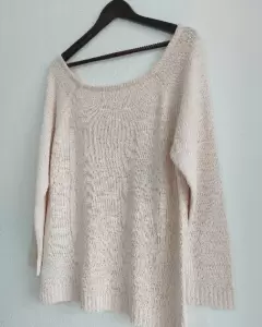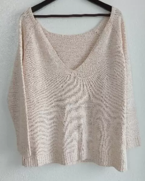 Linda blusa o suéter calientita. La talla dice S pero es bastante amplio para dicha talla por lo que queda perfecto para talla L. Tiene strech.La parte de atrás en espalda es escote V.Sin detalles. Nuevo con etiqueta. El color es entre beige y melón.De axila a axila: 57 cmLargo: 58 cm
