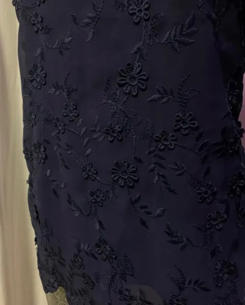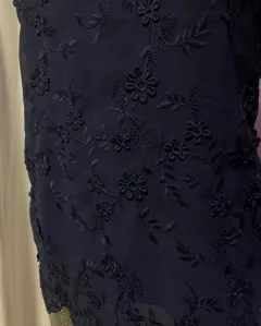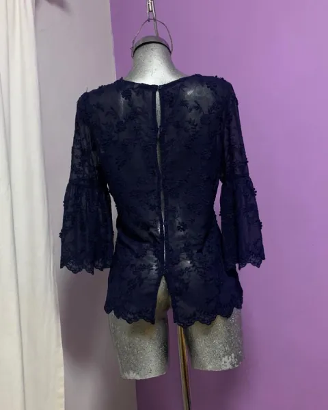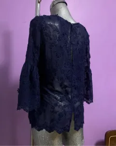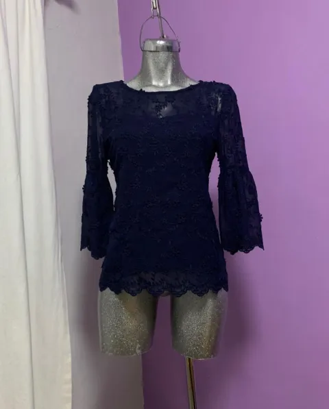 Hermosa blusita azul marino, tiene detalles cosidos, y la manga 3/4 acampanada. En la parte de atrás es abierta con botones. Le va a una talla chica.Sus medidas son: 60cm de largo, 45cm de axila a axila y 45cm de manga.