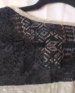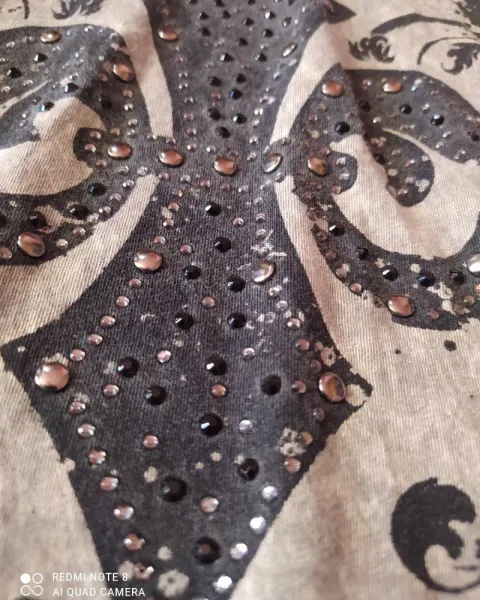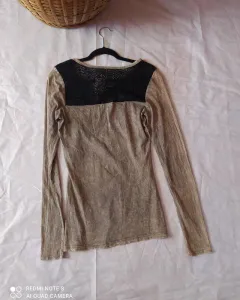 Blusita ligera, de manga larga y sin detalles, con piedritas en la parte de enfrente, por la parte detrás tiene tela tipo encaje. Es talla M.