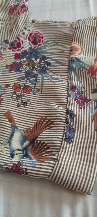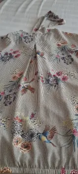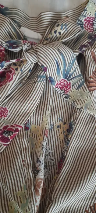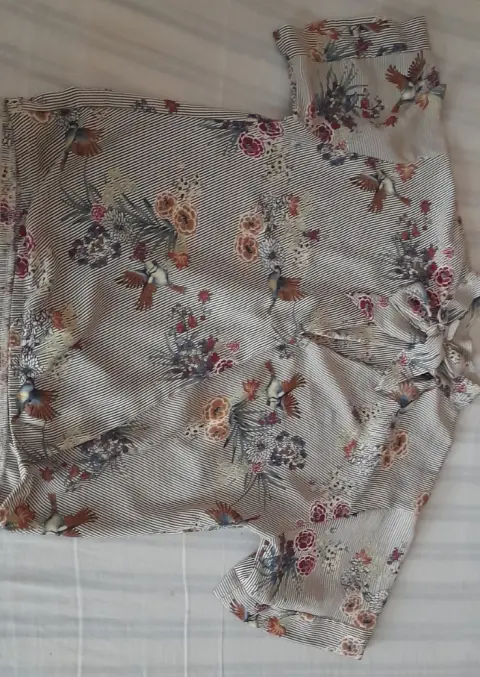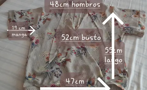 Blusita cruzada a la cintura con resorte y la tela es un poco stretch. Poliester con peso manga corta pero amplia. El cruce de la blusa está rematado y lleva una cinta al cuello muy coqueta. Fresca y linda se verá linda con mezclilla 👌 talla S medidas en la segunda foto.