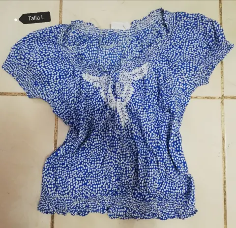 Hermosa blusa talla L, es muy fresca, colores azul y blanco, con resorte que hace se ajuste perfecto.