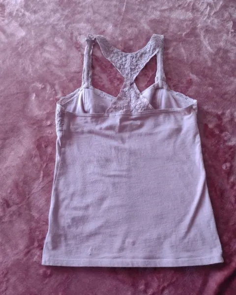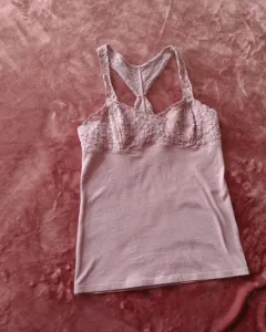Bonita blusita de tirantes, color palo de rosa, de almacén, con encaje en la parte del escote