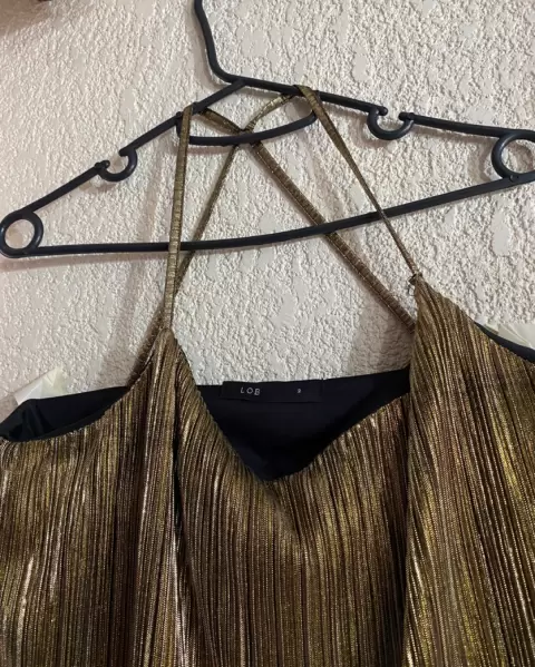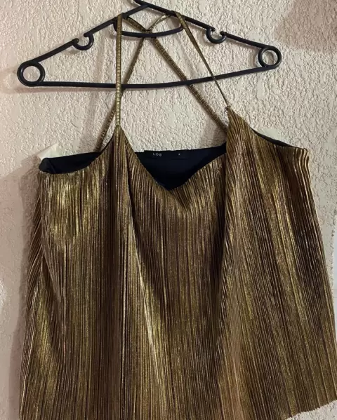 Blusita tirantes LOB. Blusita color dorada, de tirantes, de la parte de la espalda a los tirantes son cruzados, ideal para usar sin bra porque tiene fondo negro y no se transprenta. Genial para combinar con legging negro, la blusa es corta a la altura de la cadera, talla 2 de la marca Lob