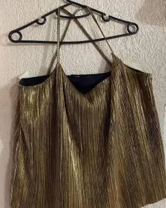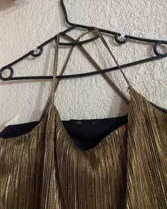 Blusita color dorada, de tirantes, de la parte de la espalda a los tirantes son cruzados, ideal para usar sin bra porque tiene fondo negro y no se transprenta. Genial para combinar con legging negro, la blusa es corta a la altura de la cadera, talla 2 de la marca Lob