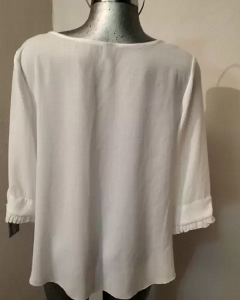 Bonito bluson blanco con cuello v y decoraciones a los costados manga larga con pliegues maraca deborah tela poliester la etiqueta dice talla chica peri queda a mediana