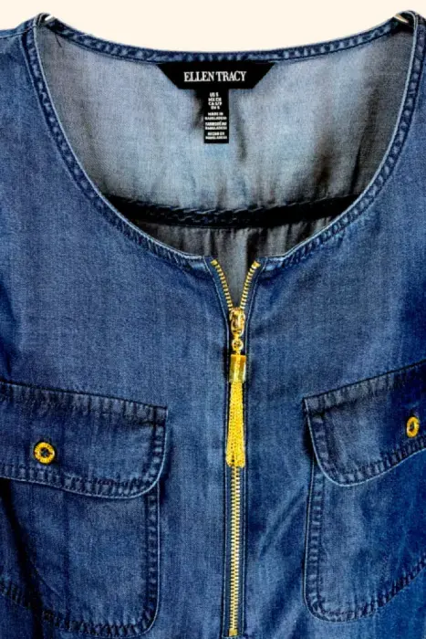 Blusón Chic Denim. Solo checa esta lindurita de blusón es marca Ellen Tracy en tipo Tencel, super ligerito con lindo detalle dorado en el cierre y bolsas al frente.👉Obtén 10% de descuento con mi código: Pinky