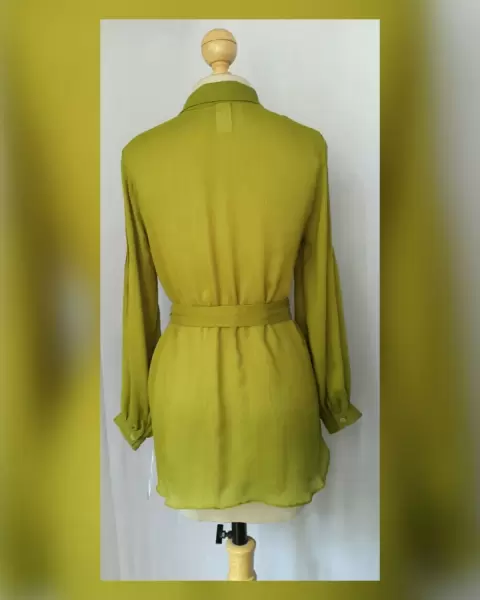 Blusón con Cinturón. Blusón color VERDE OLIVO, cuello clásico c/solapas, multiplisado en zona de busto c/botonadura blanca c/destellos verde brillante, manga larga terminada en puño, trabillas en cintura y cinturón mismo tejido p/mejor ajuste. UNITALLA (da a M/L). Dimensiones cms: 40 hombro, 54 axila, 51 cintura, 67 zona baja, 72.5 largo, 57.5 largo manga. 40% algodón, 40% poliéster, 20% licra. P/lavado en casa.
