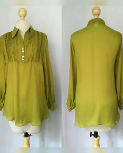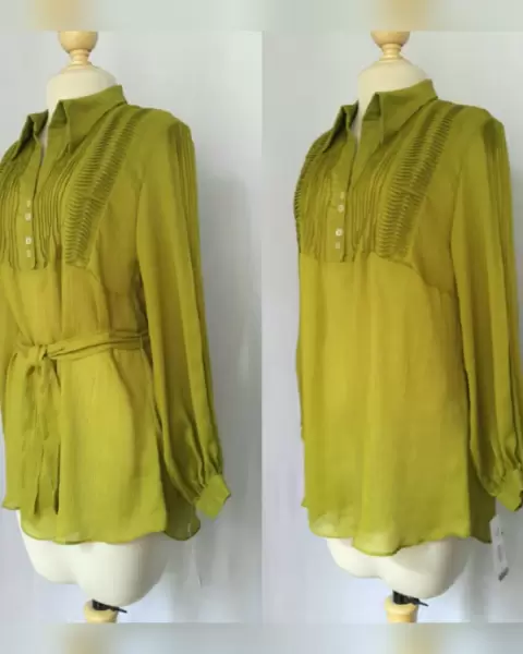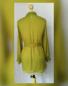 Blusón color VERDE OLIVO, cuello clásico c/solapas, multiplisado en zona de busto c/botonadura blanca c/destellos verde brillante, manga larga terminada en puño, trabillas en cintura y cinturón mismo tejido p/mejor ajuste. UNITALLA (da a M/L). Dimensiones cms: 40 hombro, 54 axila, 51 cintura, 67 zona baja, 72.5 largo, 57.5 largo manga. 40% algodón, 40% poliéster, 20% licra. P/lavado en casa.