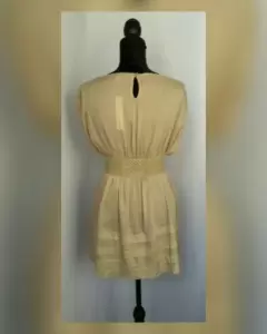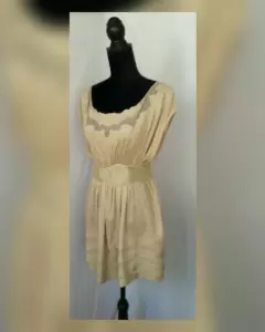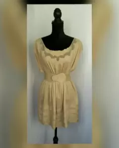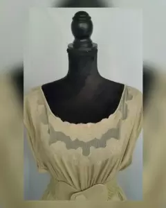Blusón color PEANUT (café), cuello barco, manga sisa, transparencia pecho c/aplique flores bordadas, cierre p/botonadura trasera, elástico en cintura c/cinturón integrado estilo crochet elástico y hebilla plástica. Talla L. Dimensiones cms: 54 hombro, 52 axila, 37 cintura (da hasta 47 p/elástico), 67 zona baja, 31 largo torax, 45 largo faldón, 76 largo total. 70% algodón, 30% poliéster.P/lav casa