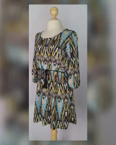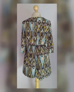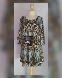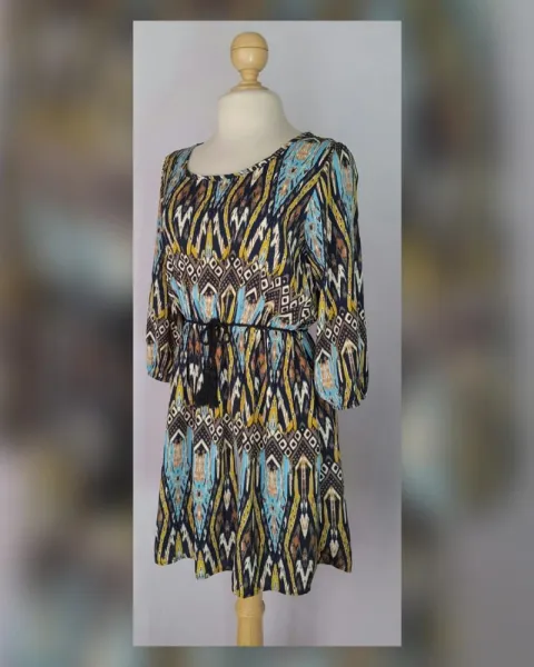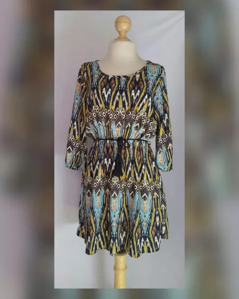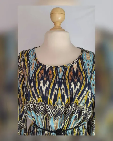 Blusón diseño tribal multicolor en tonos AMARILLOS/AZULES/CAFES/BEIGE, cuello redondo, elástico y cordón en cintura, manga 3/4. UNITALLA (da mejor a M/L). Dimensiones cms: 39 hombro, 54 axila, 35 (da hasta 56), 69 zona baja, 82 largo, 45 largo manga. 100% poliéster. Para lavado en casa.***SIN DETALLES, SE UTILIZÓ SOLO UN PAR DE HORAS***SE ENTREGA LAVADO Y DEODORIZADO***PUEDE USARSE TAMBIÉN COMO VESTIDO***