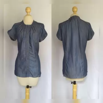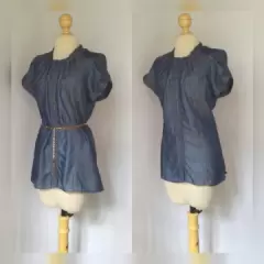 Blusón en Mezclilla. Blusón en mezclilla color AZUL ÍNDIGO c/efecto tornasol, cuello redondo c/elástico, manga corta abombada c/botones cocidos tono ORO ENVEJECIDO, 2 bolsos frontales c/botonadura, cierre mediante botonadura tono ORO ENVEJECIDO y cinturón trenzado en fake fur c/bisuteria dorada y tonos tierra para mejor ajuste. Talla 34 (REDUCIDA, da mejor a 30/32). 100% tencel. Para lavado en casa.