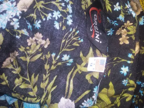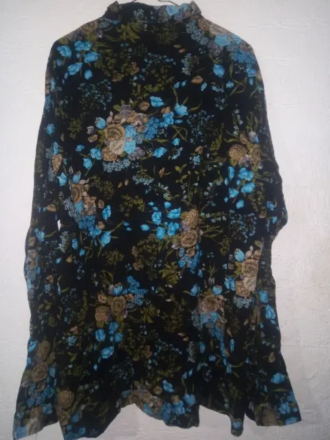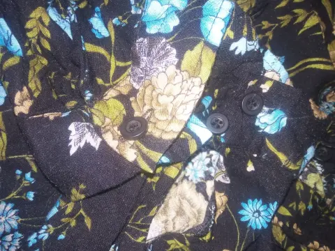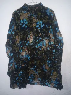 Blusón estampado en plantas en color negro, azul, café, beige. Tiene 10 botones, 2 en cada manga, una bolsa al frente del lado izquierdo. Mide de axila a axila 170 cm y de largo 82 cm, más o menos. Se entrega planchada.