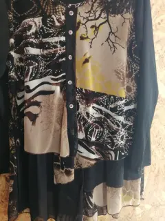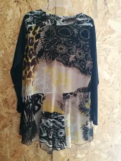 Blusón estampado con vuelos, T-L, tonos negro, café y beige, mangas largas, axila 52 cms., largo 81 cms