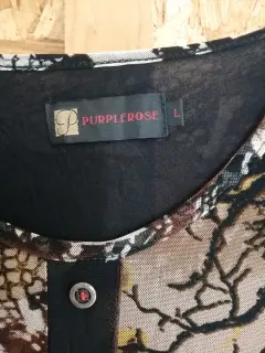 Blusón estampado Purplerose. Blusón estampado con vuelos, T-L, tonos negro, café y beige, mangas largas, axila 52 cms., largo 81 cms
