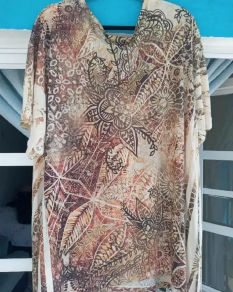 Bluson estampado tipo tribal de los lados termina en picos en el cuello cuenta con un pequeño bordado de la misma tela y con piedras pequeñas, tela fresca. Si te gusta algo más te armo paquete.
