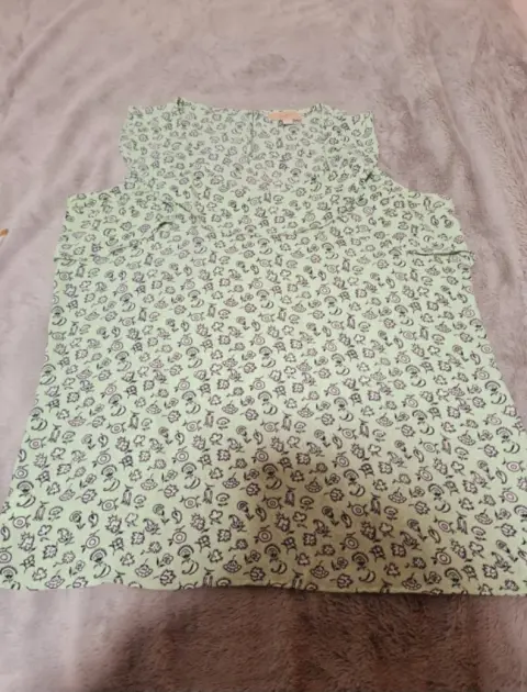 Tela fresca y ligeraCon olanes en cuello y axilasNueva sin detallesHombros descubiertosAncho hombros 30cmAncho axilas 55cmLargo 71cm