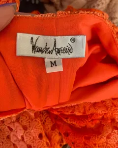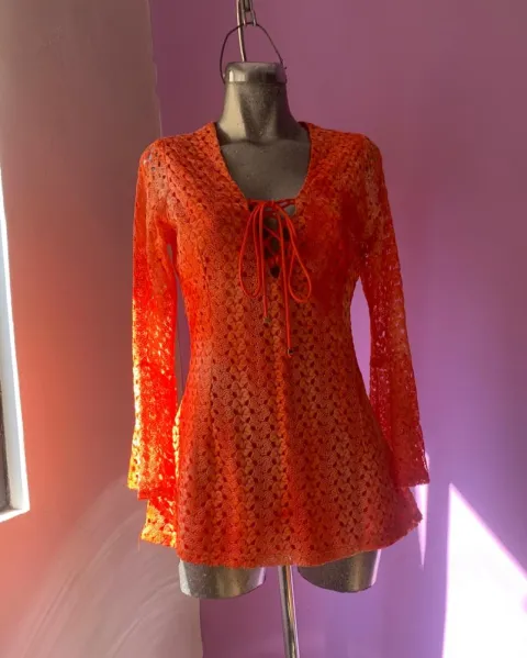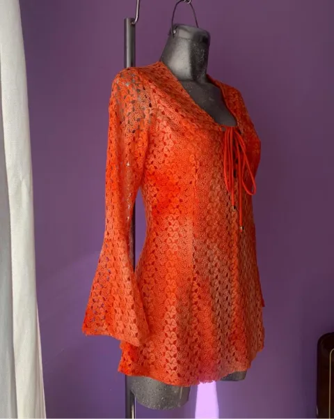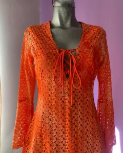 Blusón naranja tipo crochet. Precioso blusón en tonos naranjas, manga acampanada y escote en V con una cinta. Va bien a una talla chica y mediana. Medidas: 70cm de largo, 43cm de axila a axila y 57cm de manga.