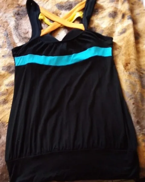Blusón negro de algodón Spandex. Blusón de licra y algodón, estira mucho. Con tiras de colores en la espalda. Tiene copas. Tiene plisado al frente y elástico en la espalda. Abajo termina en una franja amplia y ajustada a la altura de la cadera.