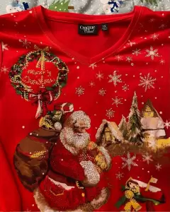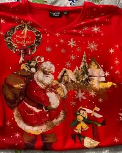 Blusón rojo con pedrería. Es delgado con pedrería y motivos Navideños. Estira y se amolda al cuerpo. Muy lindo