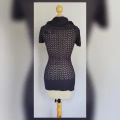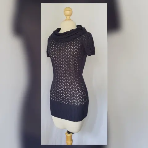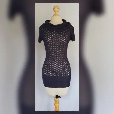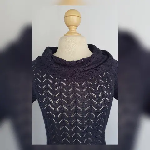 Blusón en tejido de punto canale color AZUL MARINO, cuello ruffle y manga corta. Talla M/L. Dimensiones cms: 41 hombro, 50 axila, 41 cintura, 45 zona baja, 64 largo, 17 largo manga. 100% acrílico. Para lavado en casa.