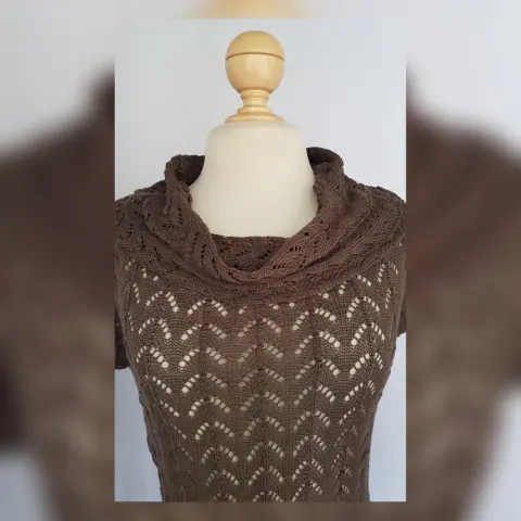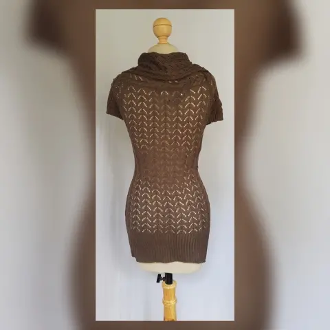 Blusón Tejido Punto Canale TABACO. Blusón en tejido de punto canale color TABACO, cuello ruffle y manga corta. Talla M/L. Dimensiones cms: 40 hombro, 50 axila, 41 cintura, 47 zona baja, 69 largo, 16 largo manga. 100% acrílico. Para lavado en casa.