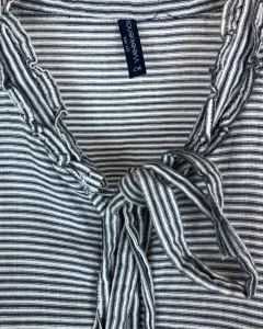 Blusón Weekend en líneas azul y blanco, con un bello detalle en el cuello y nudo al pecho, pieza perfecta para un outfit sofisticado.