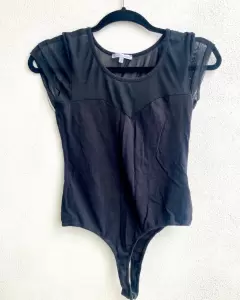 Boddy negro, con transparencia en la parte superior hasta inicio del busto. Queda pegadito y es muy combinable con cualquier prenda. No tiene detalles