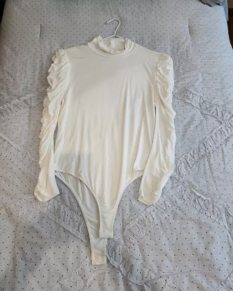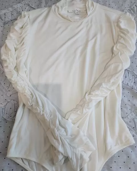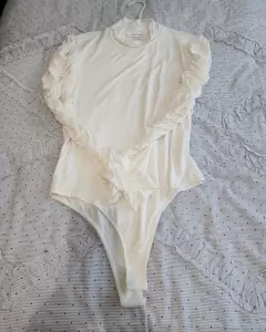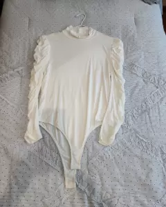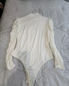 Body blanco con manga larga plizada. Body blanco con cuello alto y manga plizada largaMuy elegante Combina con pantalón de vestir de cualquier color Talla M/G
