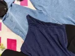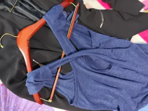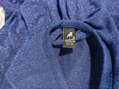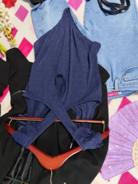 Body Azul marino / glitter plateado. Tela ligera, stretch, amolda al cuerpo. Tirantes cruzados con escote circular en la espalda. Escote V.
