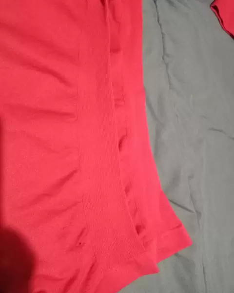 Bolsa roja. Blusa básica cuello alto, manga larga, de licra tipo faja, es lisa con líneas de la misma tela en los costados.