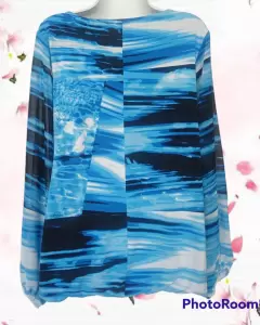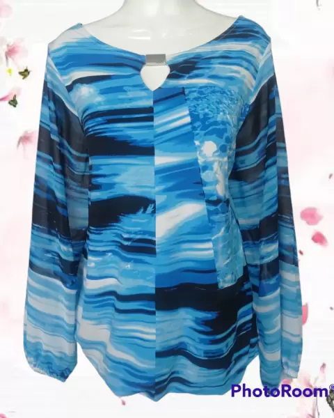 Linda blusa amplia talla L a Xl porque la tela estira.Trae lindo detalle de metal al frente y manga larga con resorte al puño.
