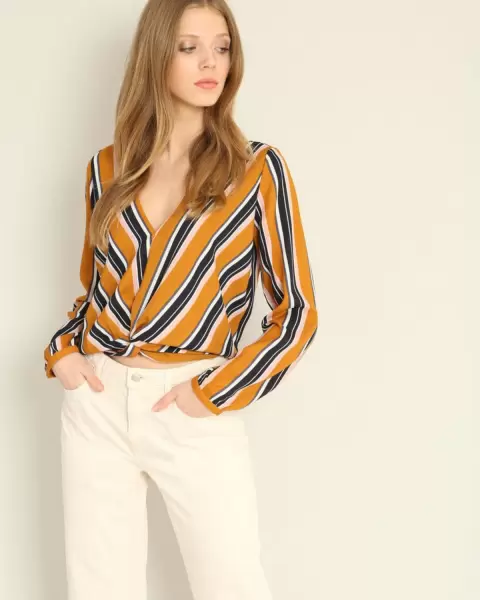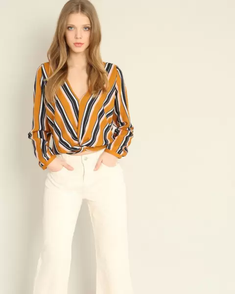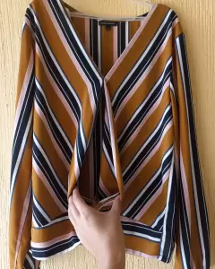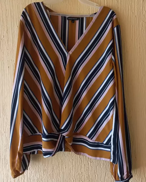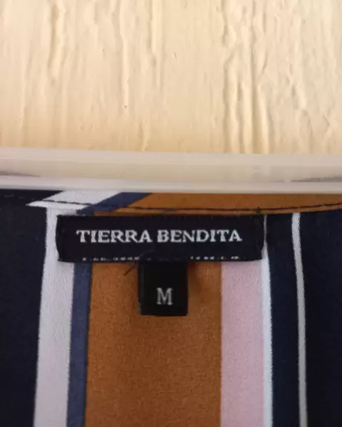 Bonita blusa color mostaza a rayasEscote en VAbertura en la parte centralTalla MMarca Tierra Bendita