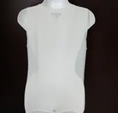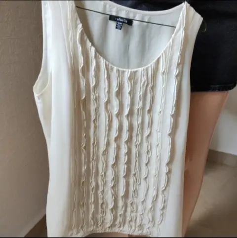 Bonita Blusa Rafaella. Blusa Rafaella color beige sin mangas. Escote redondo. La parte de atrás es transparente, queda pueper bien con un bralette. De frente tiene decoración de olanes. Talla M