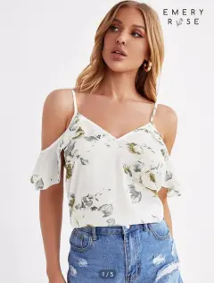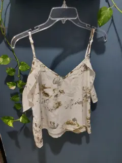 Bonita blusa floreada de tirantes ajustables, a la cintura, con olanes en hombros