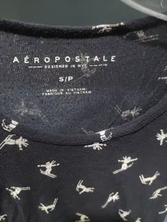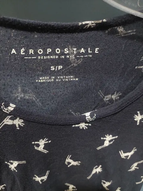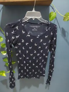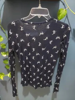 Bonita blusa transparente con estampado de ski, azul marino, con manga larga, excelente estado.