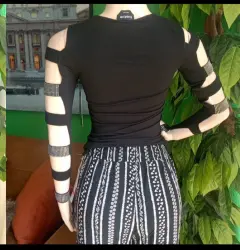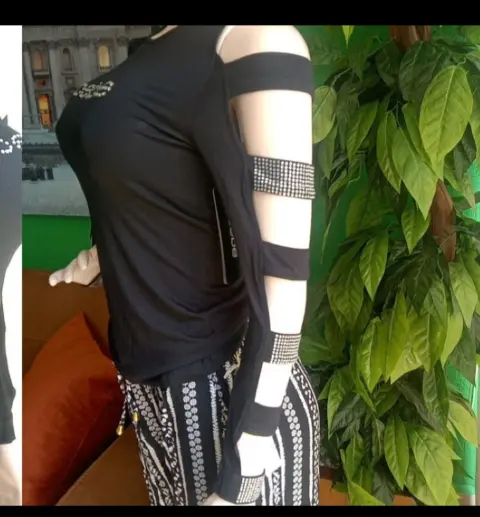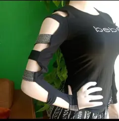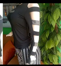 Bonita y muy moderna blusa. Blusa color negro con inscrustaciones de piedritas en el logo de la marca.Manga larga en secciones lisas y con piedras. Cuello redondo.Talla SHombro a hombro: 33cmAxila a axila: 36cmLargo desde hombro: 56cmMaterial:👉95% rayón👉5% spandexMarcas originales importadas de USA.