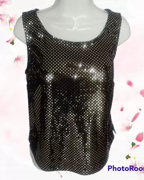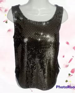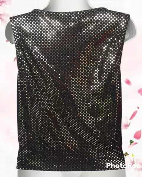 Vibrante blusa con lentejuelas doradas, ideal para llevar de noche.La tela estira bastante por lo que te dará una talla M hasta L.
