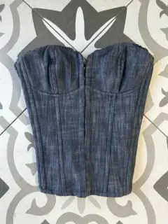 Bustier de mezclilla. Marca Nicholas. Talla S. Medidas: Ancho 32 cm, Largo 32 cm.